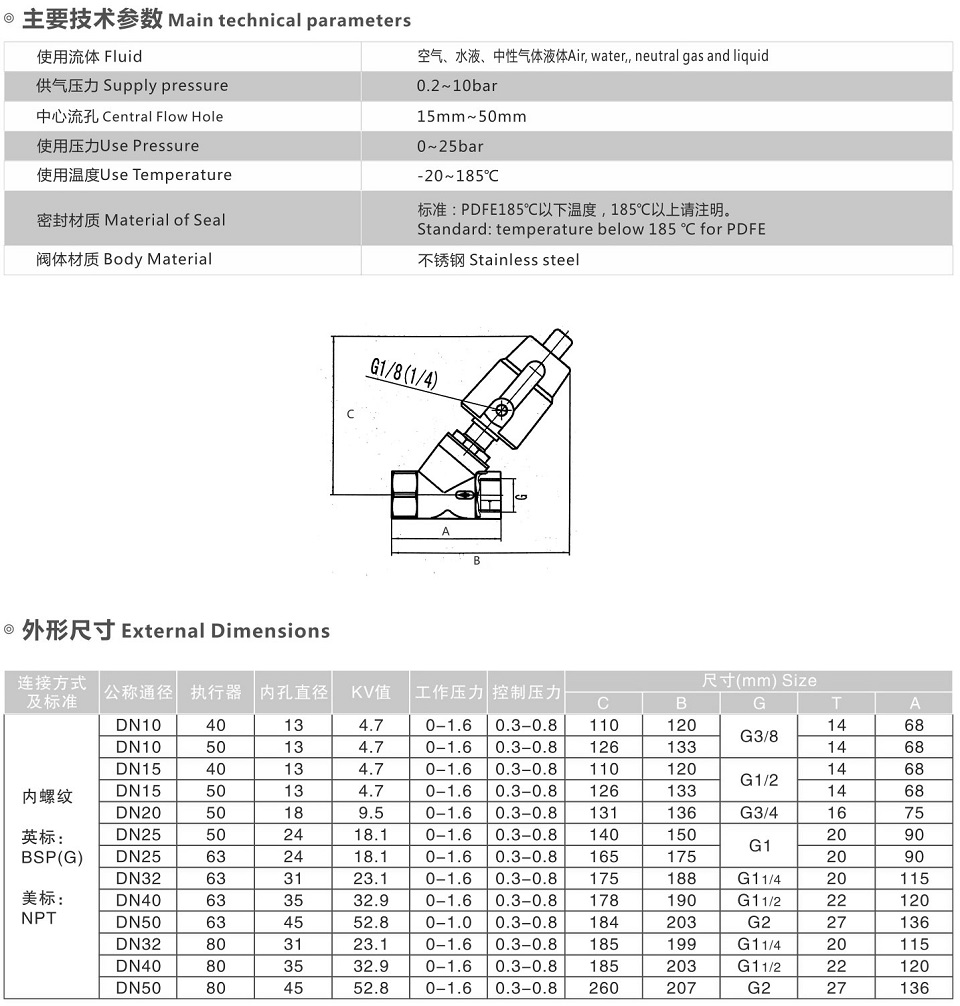 本閥為常閉型二位二通活塞角座閥,通入氣源后,在氣壓的作用下推動(dòng)活塞帶動(dòng)閥芯向上運(yùn)動(dòng),將主閥開啟,關(guān)閉氣源后在復(fù)位彈簧的作用下將主閥關(guān)閉